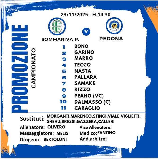 Battuta d’arresto per il Pedona nella trasferta di Sommariva Perno. Con Zappatore squalificato, la squadra borgarina è stata guidata in panchina da Olivero Filippo ed ha trovato subito il vantaggio al 6’ grazie al solito Dalmasso. La risposta dei padroni di casa non si è fatta attendere: al 12’ Gulenne ha firmato il pareggio. Nonostante le occasioni create, i biancoblù non sono riusciti a concretizzare e il primo tempo si è chiuso sull’1-1. Nella ripresa la prestazione del Pedona è apparsa sottotono e il Sommariva ne ha approfittato colpendo due volte, al 1’ con Dia e al 50’ con Cornero, fissando il risultato sul 3-1. Un passivo forse eccessivo, parzialmente attenuato dalla pesante sconfitta dell’altra capolista Moretta, travolta in casa 5-1. Domenica prossima le due formazioni si affronteranno nello scontro diretto al comunale di Borgo San Dalmazzo.