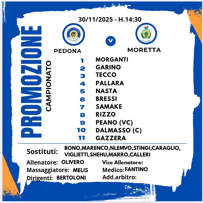 Nella ripresa il match si accende, condizionato dalle decisioni discutibili del direttore di gara, che con cartellini e fischi mancati favorisce il Moretta e innervosisce la partita. Il Pedona recrimina anche per un palo e una traversa che avrebbero potuto cambiare l’esito dell’incontro.