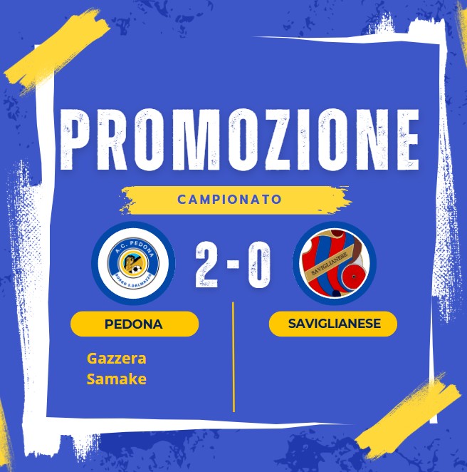 Prestigiosa vittoria del Pedona, che nel big match contro la Saviglianese, nonostante una formazione rimaneggiata, si impone per 2-0 e resta incollato alle capoliste Carmagnola e Moretta. La gara si decide già nel primo tempo: al 28’ Gazzera approfitta di una carambola favorevole per sbloccare il risultato, mentre sul finire della frazione Samake firma il raddoppio con un pallonetto preciso che supera il portiere avversario.